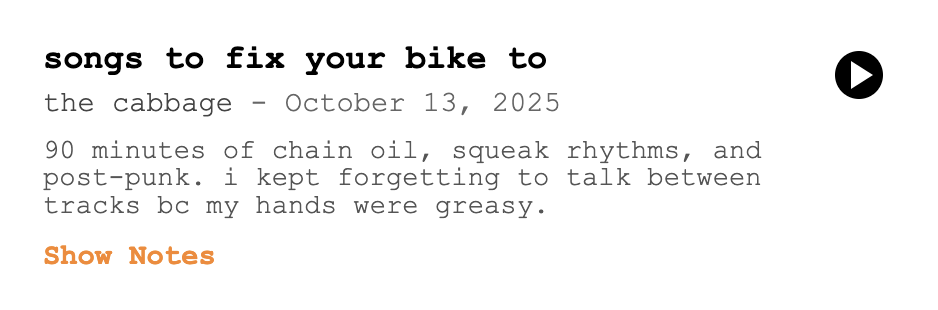 Show notes the cabbage — October 18, 2025 Keep an eye out for show notes and blog posts created by our DJs